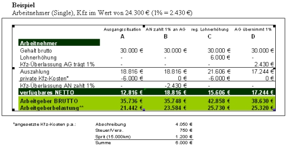 Anhand dieses Beispiels sehen Sie, wie sich die Kfz-Überlassung positiv auf das Netto beim Arbeitnehmer auswirkt, ohne das der Arbeitgeber mehr aufwendet. Es können natürlich auch beide Seiten profitieren.