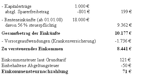 Jeder Steuerpflichtige hat 7.834 € (2008: 7.664 €) im Jahr steuerfrei (Grundfreibetrag). Damit bleibt der deutsche Durchschnittsrentner vom Fiskus verschont. Alleinstehende können ca. 19.000 Euro Einnahmen im Jahr verbuchen, Ehepaare das Doppelte. Sind die steuerpflichtigen Einkünfte höher, ist unbedingt die Abgabe einer Steuererklärung zu prüfen. Außerdem steigt der steuerpflichtige Anteil der Rente, je später Sie beginnt, was pauschale Aussagen erschwert.